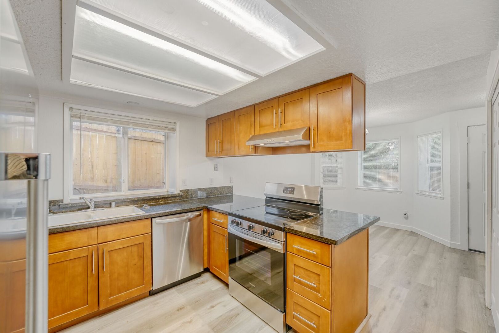 Welcome to this inviting ground-floor apartment in Tacoma, WA. This two-bedroom, one-bath unit features luxury vinyl plank flooring and quartz countertops for a clean, modern finish. The kitchen is equipped with stainless steel appliances, and a full-size washer and dryer are included for everyday convenience. Bay windows add character to the living space and invite in natural light throughout the day. Ideally located near restaurants, shopping, and grocery stores, the property also offers quick access to Pacific Lutheran University and Lake Spanaway Golf Course—just a five-minute drive away. Enjoy comfortable living in a convenient and connected Tacoma location.